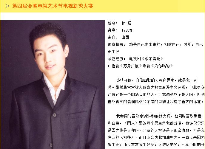 孙强2003年参加中国金鹰电视艺术节新秀大赛,进入前十强,十强里面还有周一围、孙坚、高昊。