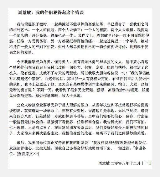 在2008年的倪震偷吃大学生事件里,周慧敏曾经伤心到发表声明分手。