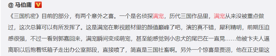 但满宠的扮演者屠楠把这个反派角色演得既可爱又可恨,精明又有点贱兮兮,让原本存在感不高的满宠快要成为大家的团宠了。