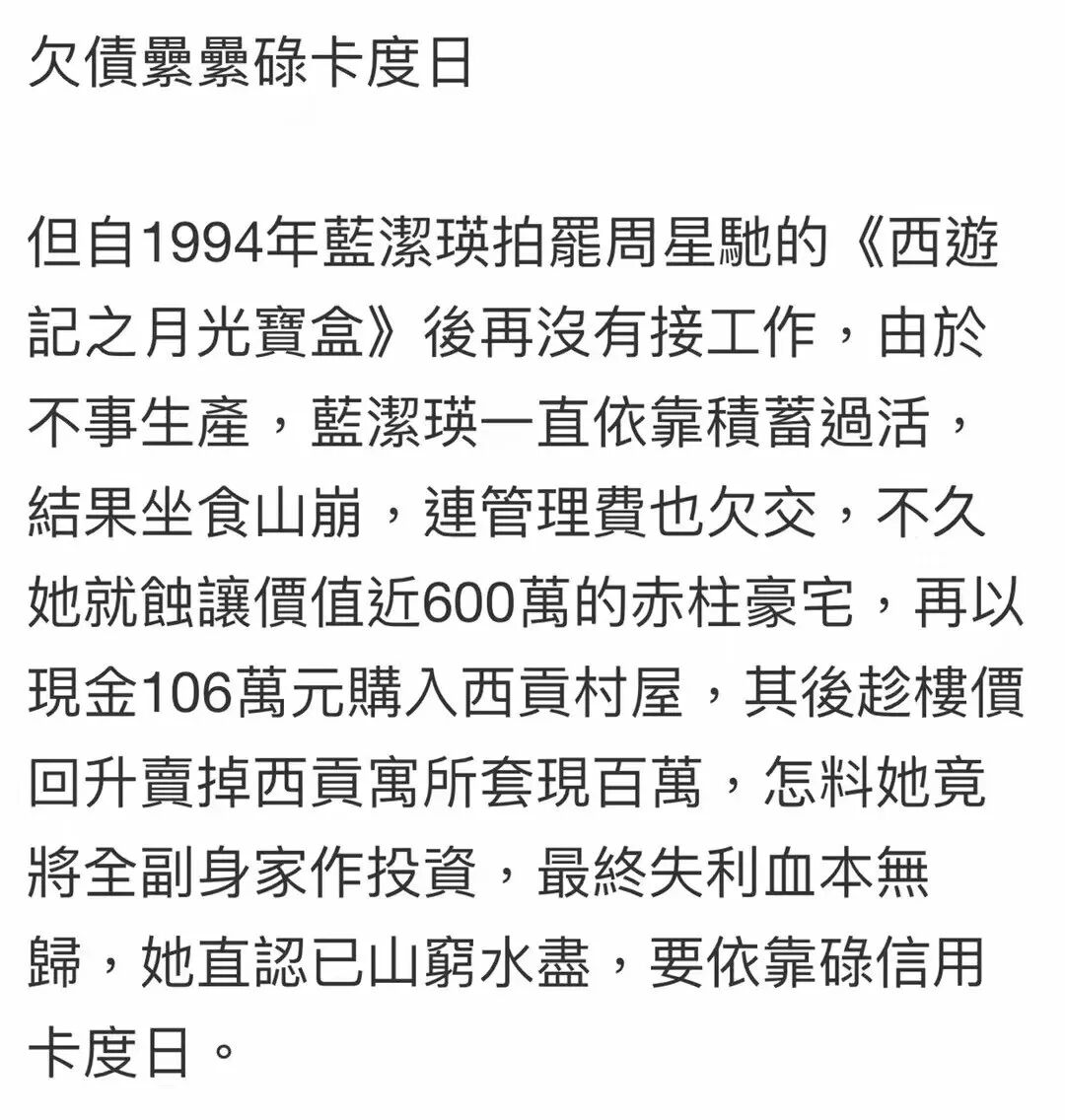 2005年,蓝洁瑛破产,港媒对她的报道多是“落魄”和“贫困”。
