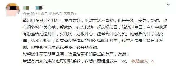 在蓝洁瑛离世前,她的影迷会曾公开过她的近照:面色红润,气色也不错。