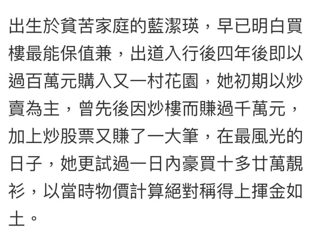 美貌加持,加上演技不差,蓝姑事业扶摇直上,收入颇丰,出道后第四年便已买房、炒股。