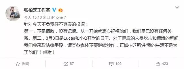 恰巧张柏芝也在一次直播中五次提到了“8月8日”,刚好是王菲的生日,大家立即把这两件事联想到一起。很快,张柏芝回应“没有记恨,已经不爱谢霆锋,会祝福他们。”她解释,8月8日是Lucas入学的日子。
