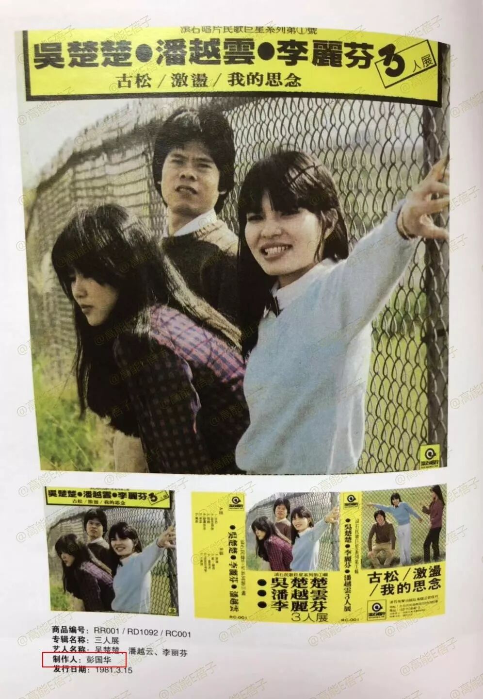 在这样的大环境下,段氏兄弟也不甘只做介绍外国音乐的杂志,他们开始涉足唱片领域。1981年滚石推出第一张由吴楚楚、李丽芬、潘越云演唱的合辑《三人展》,吴楚楚早期也和杨弦、胡德夫等一起玩民歌,后来和彭国华一起创办了飞碟唱片。
