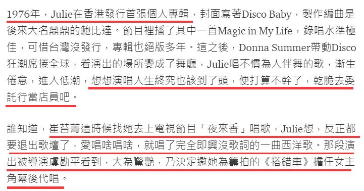 导演虞戡平在崔苔菁的《夜来香》节目里看到了唱歌很有爆发力的Julie,决定请她来唱电影里的歌。