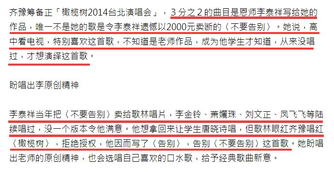 齐豫没有回应前夫指责,只在这年的演出上唱了李泰祥一直拿不回版权的《不要告别》。