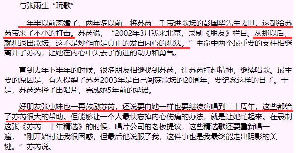 2001年,彭国华病逝。苏芮经历了离婚,一手提携她的“伯乐”彭国华也去世了,那令她一度很消沉,逃避媒体还想退出歌坛。