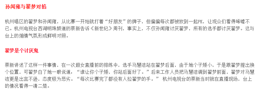 就后来杭州本地媒体的报导来看,这唱区选手内斗非常严重,塑料姐妹成了杭州唱区的日常,也比较影响观感。