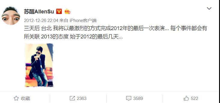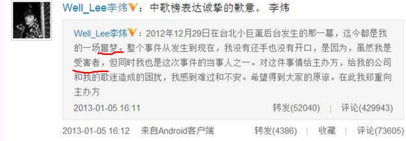 后来话痨苏又发了一条“三天后见”的预告,三天之后的12月29号就是中歌榜,也就是已经官方锤了的苏醒在后台把李炜暴打了一顿。