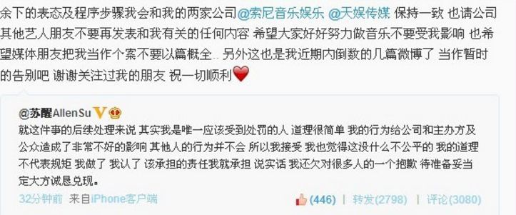 之后俩人就开始微博掐架,苏醒发“苹果论”,暗示有人“偷吃”。