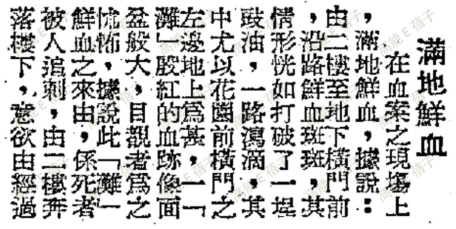“恍如打破了一埕豉油……一滩殷红的血迹像面盆般大,目击者为之怵怖”。