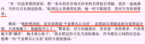 开始她不敢接受这么贵重的礼物,但在富商诚恳打动下,最终还是收下了这份“朋友之间的纪念品”。
