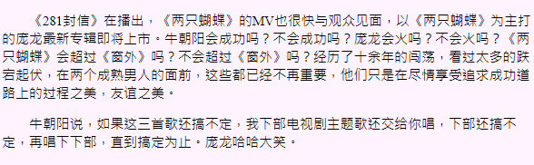 当时的通稿小作文也real感人:“牛朝阳说,如果这三首歌搞不定,我下部电视剧主题曲还交给你唱,不行下下部,直到搞定为止……”真·感天动地兄弟情。