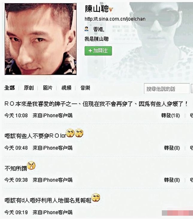大年初三,陈山聪连发五条微博疑攻击周柏豪,说自己不会穿某牌子,因为“有些人穿坏了”,还说有人利用别人的名字见报。
