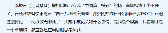杨二车娜姆因为经常头戴红花,被柯以敏形容是“中国第一媒婆”。杨二车娜姆的回应也很毒辣:“我看她才是一个单细胞,简直就是在用屁股思考问题。”