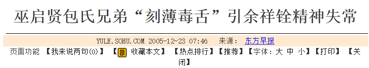 2005年,巫启贤曾和包小柏、包小松一起, 在台湾省的综艺节目《快乐星期天》中,把余天的儿子余祥铨骂到精神崩溃。