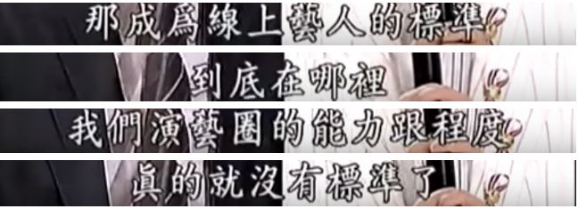 接着就是车轮战式的毒舌点评:“有了乐队伴奏你就是天王吗?这只是变成你的高级卡拉OK场所”,“不要以为你爸妈是余天、李亚萍,就可以进入演艺圈”,“成为线上艺人的标准到底在哪里?”。