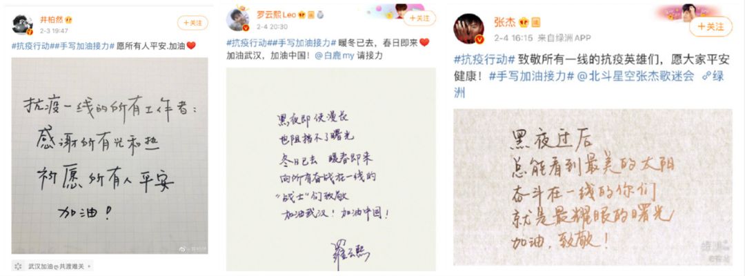 这几天有企业在微博发起“手写加油接力”,也有很多明星积极响应,