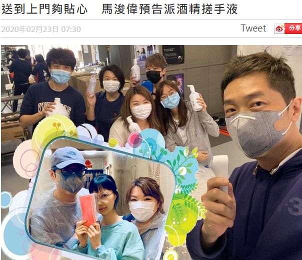 比如马浚伟就率领自己的爱心粉丝,一起将酒精搓手液分成800多份,逐一派给有需要人士,包括前线医护人员及不能上街的重症病患者,非常有心。