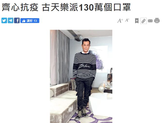 更豪气的古天乐不仅让酒楼员工放有薪假,还先后向社会派了130万个口罩。