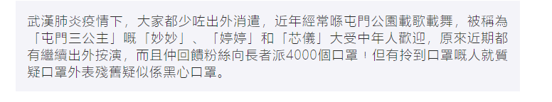 同样是给老人家派口罩,古天乐捐了130万个也是低调行事,但香港网红“屯门三公主”却把口罩和自己的演出捆绑。