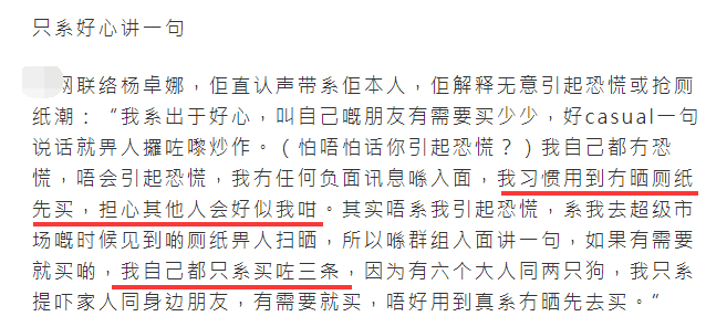 很快,杨卓娜承认,女声的确是自己。但她一再强调,自己只是看到别人在买厕纸,就好心在群里叫朋友有需要就买一些,无意制造恐慌。