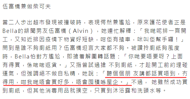 还有艺人林颖彤,被拍到在超市里和绯闻男友伍富桥一起抢厕纸,媒体的小作文是这样写的: