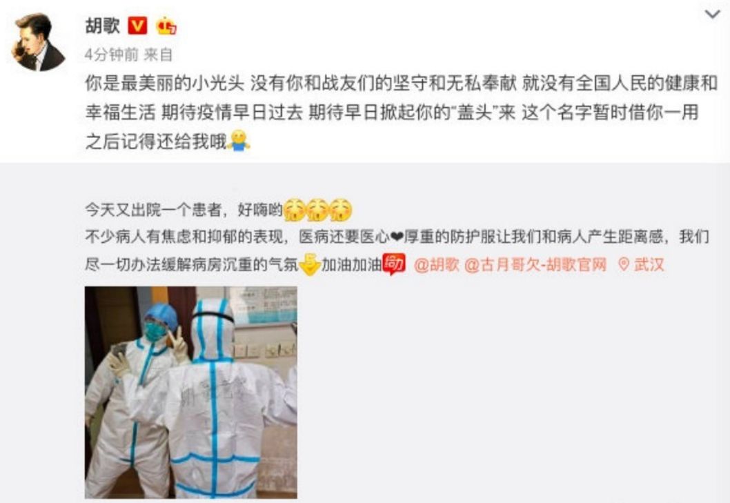 除了周星驰,很多艺人翻牌为前线粉加油打气。胡歌就和防护服上写着“胡歌老婆”的医护人员来了一场甜蜜互动。
