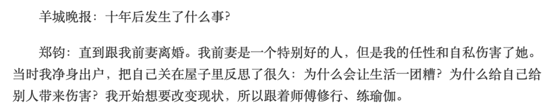 最后,郑钧已经被彻底洗脑,他还会略带诚恳地说:“我从她身上了解到,我是一个多么不靠谱的人,我必须改变。”