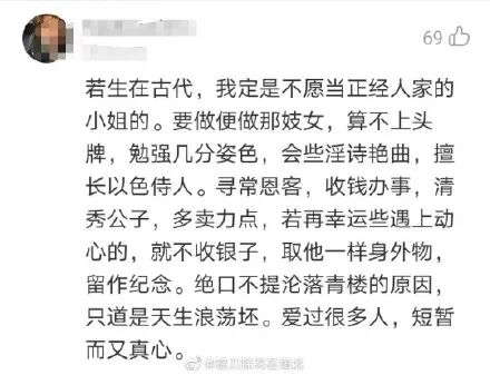 微博还有迷惑言论说想要回古时候当妓女,还不是头牌那种,“会些淫诗艳曲,擅长以色侍人……寻常恩客,收钱办事,清秀公子,多卖力点”,字里行间,陶醉于自己的幻想中。