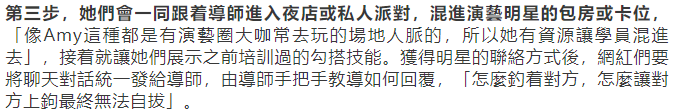 第三步,则是跟随导师进入夜店或私人派对,混进明星包房或卡位,接近“目标”。获得联络方式后,还会有导师手把手指导回复方法,直到对方完全“上钩”。