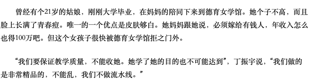 一开始培训者以女德为基础,主要教授与婆婆的相处之道,以及第一次见家长应该穿什么衣服之类的。