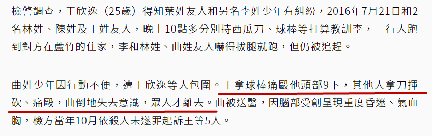 而被他们砍伤的曲姓少年,在医院昏迷半年不治身亡。王欣逸与同伙分别被以杀人、共同伤害致死罪起诉。