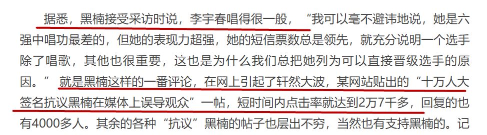 作为评委之一的黑楠,都曾在采访里说过,李宇春论唱功并不是所有人里最强的。他的发言也引起了争议,支持者拍手称快,李宇春的粉丝则觉得是评委下场“带节奏”。