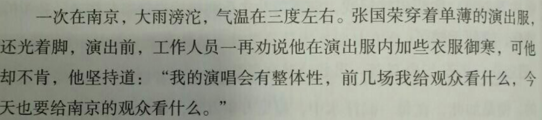 有一次在南京演出,气温只有三度左右。张国荣穿着单薄的演出服,光着脚。工作人员劝他要加些衣服御寒,他坚持说:我的演唱会要有整体性,前几场我给观众看什么,今天也要给南京的观众看什么。