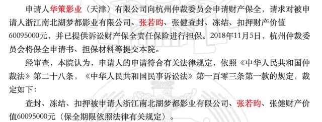 这个案子在一审时就已经判定,对张若昀、张健、南北湖梦都公司扣押财产价值6000万。