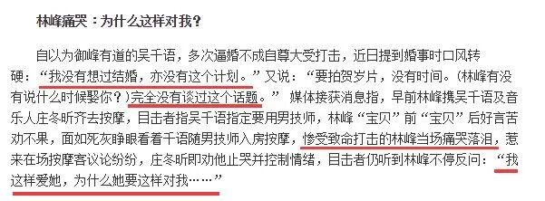 曾有传闻吴千语和林峯一起去按摩,而吴千语指定要男技师,林峯“宝贝”前“宝贝”后都劝说失败,眼睁睁看着心爱的千语BB随男技师入房按摩,林峯当场痛哭落泪,不停问:“我这样爱她,为什么她要这样对我……”