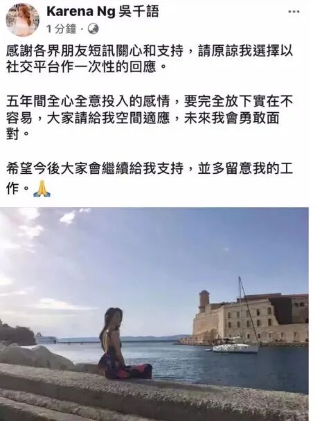 推测吴千语应该是和林峯在谈分手的期间认识的施伯雄,然后保持了一段时间的好朋友关系。一直到2018年7月,吴千语在自己的社交媒体上po了一束鲜花的照片,tag了施伯雄的名字,算是正式公开恋情。