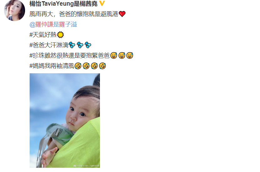 结婚生子之后,杨怡更是花式夸赞,在她的眼里,罗仲谦就是一个又顾家又宠妈的好爸爸、好老公。