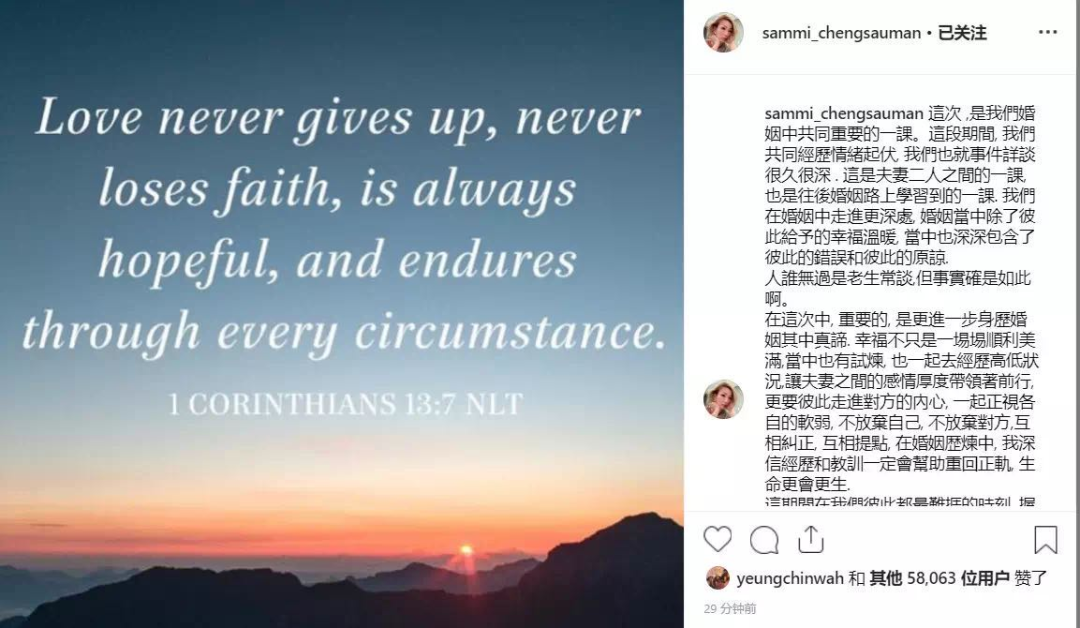 许志安虽然没有拉郑秀文出来说话那么拼,但靠着郑秀文ins发的原谅宣言,他确实也完成了洗白的第一步。