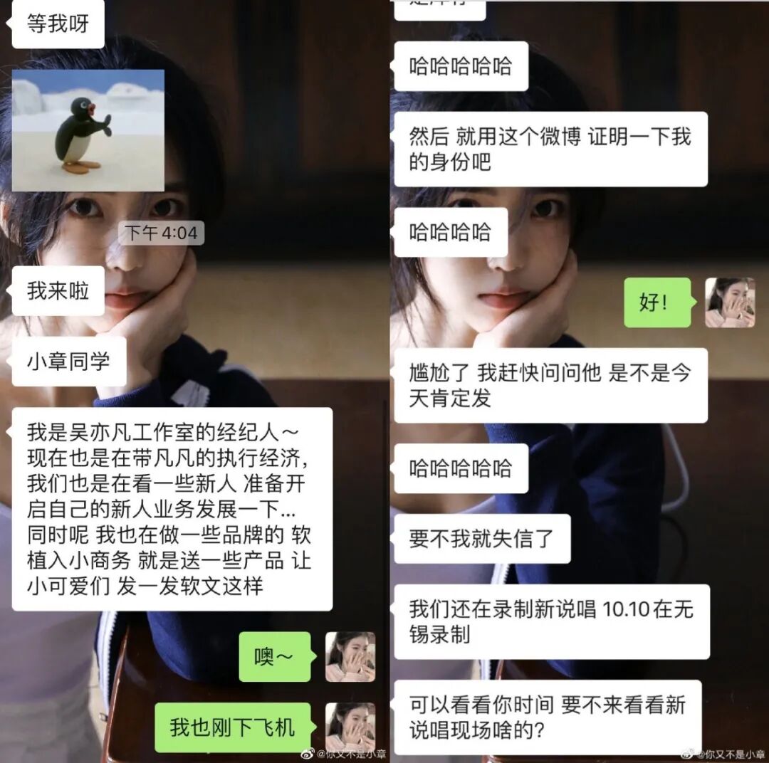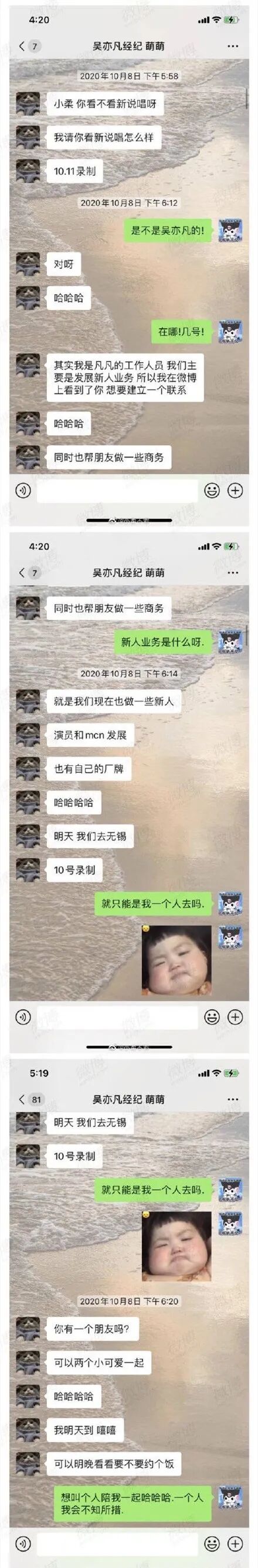 她拒绝后,有一个自称吴亦凡的工作室经纪人称“在看一些新人”,准备发展一下新人业务,邀请他去“新说唱”现场看看,
