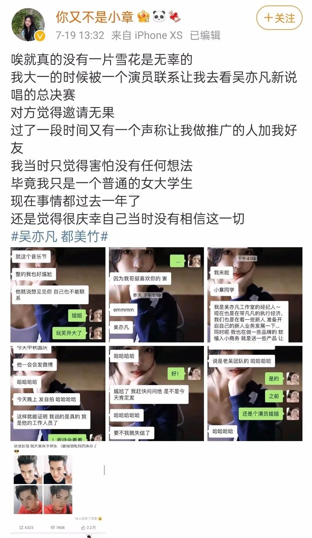 昨天晚上,都美竹在微博发表了千字长文,详细讲述了各种吴亦凡的黑料,然后把这篇微博置顶。
