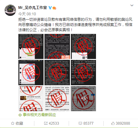 紧随其后,吴亦凡工作室也严正声明,表示“启动法律追责程序并完成报案工作”。