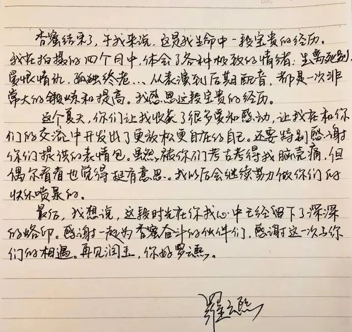 罗云熙在《香蜜沉沉烬如霜》大结局后,发了手写信,回忆成长、感谢粉丝。内容简单,但是字迹不错,看完让人确实有“演员用心了”的感受。