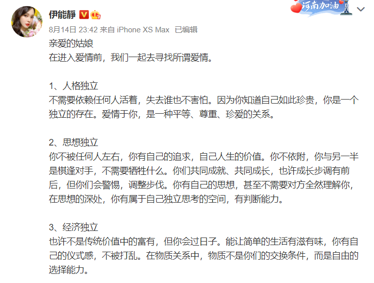 男有于正,女有伊能静。智慧先驱伊能女士的小作文,带有一种宝岛风味的旖旎与……与情感公众号kol味儿。