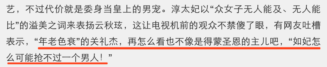偏偏剧里还把一个委身给皇上当男宠的“爆点”安排在关礼杰身上,给他的形容是“众女子无人能及、无人能比”,看得网友直吐槽,“年老色衰”的关礼杰,怎么看也不像是德蒙圣恩的主儿吧,如妃怎么可能抢不过一个男人!