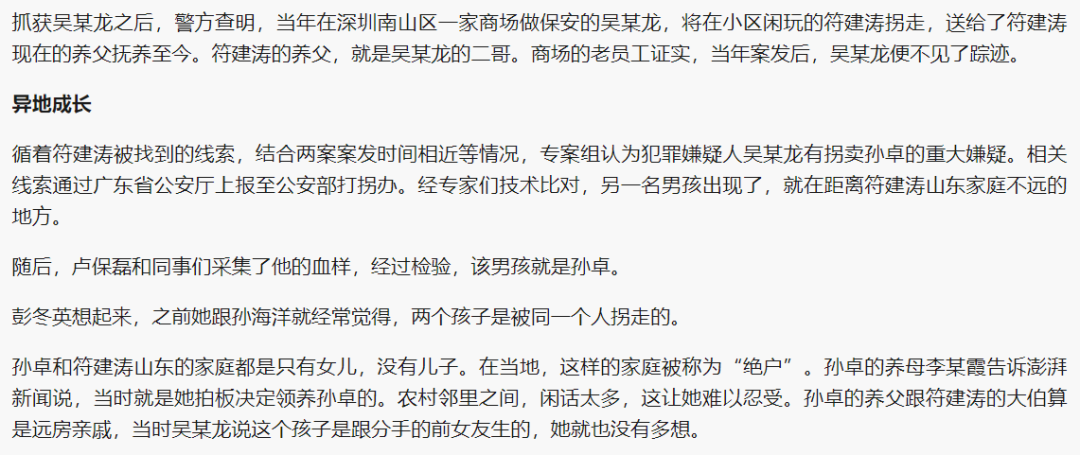 况且,这次孙卓能被找到,是另一位被拐的符建涛提供线索的,他从孙卓被拐的视频里发现人贩子很像当年带走他的“吴三叔”,顺着吴三叔的线索,还能发现孙卓的养父跟符建涛的大伯算是远房亲戚……这千丝万缕的关系,也让人猜测人贩子和买家来自同一家族。