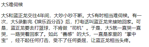 倒有媒体总结出了大S和蓝正龙交往之“难”,说大S就是受不了任何委屈,只因为蓝正龙要打篮球不想给她做司机,她可以一直哭一直哭,哭着回家。