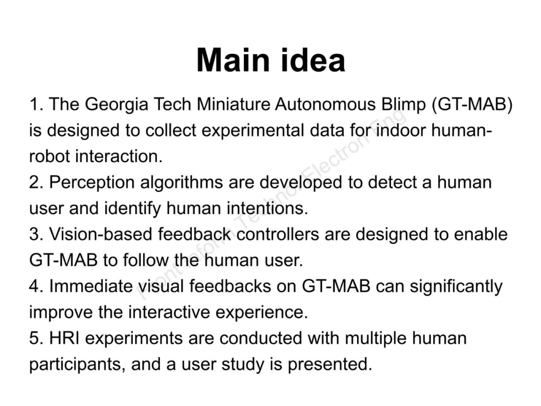 为支持室内环境下长达两小时及以上的人机交互实验,我们研发了一款“佐治亚理工全自动迷你气球飞行机器人”(GT-MAB)。GT-MAB可以安全地与人近距离互动。该机器人具有人脸识别、自动跟踪人类使用者以及手势识别等功能。采用深度人工神经网络检测GT-MAB实时视频信号中人类使用者的脸和手,并基于此功能,设计一套人机交互系统实现GT-MAB与使用者之间的自然交互。GT-MAB的学习算法可以自主识别两种手势,因此在交互过程中,使用者无需佩戴任何装置就可与GT-MAB互动。基于机器视觉的反馈控制器可控制GT-MAB自动追踪并跟随使用者。一旦机器人成功识别使用者的手势,机器人会以对应的飞行轨迹回应使用者手势,同时将识别结果以及意图通过其自身搭载的LED显示屏展示给使用者。实验数据表明,向人类使用者展示的视觉信号能明显提高人类使用者和GT-MAB之间的交互体验。实验结果表明,GT-MAB作为一款新型飞行机器人,可在室内环境下安全地与人互动并有效采集人机交互数据。