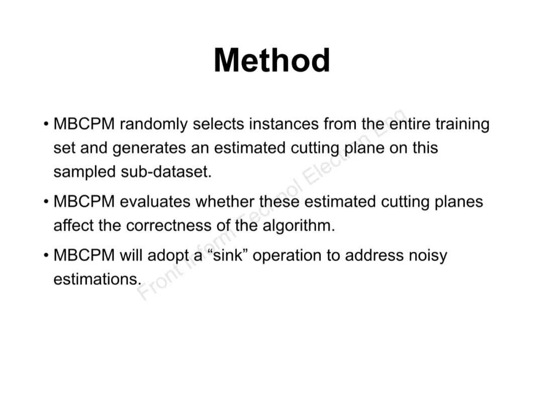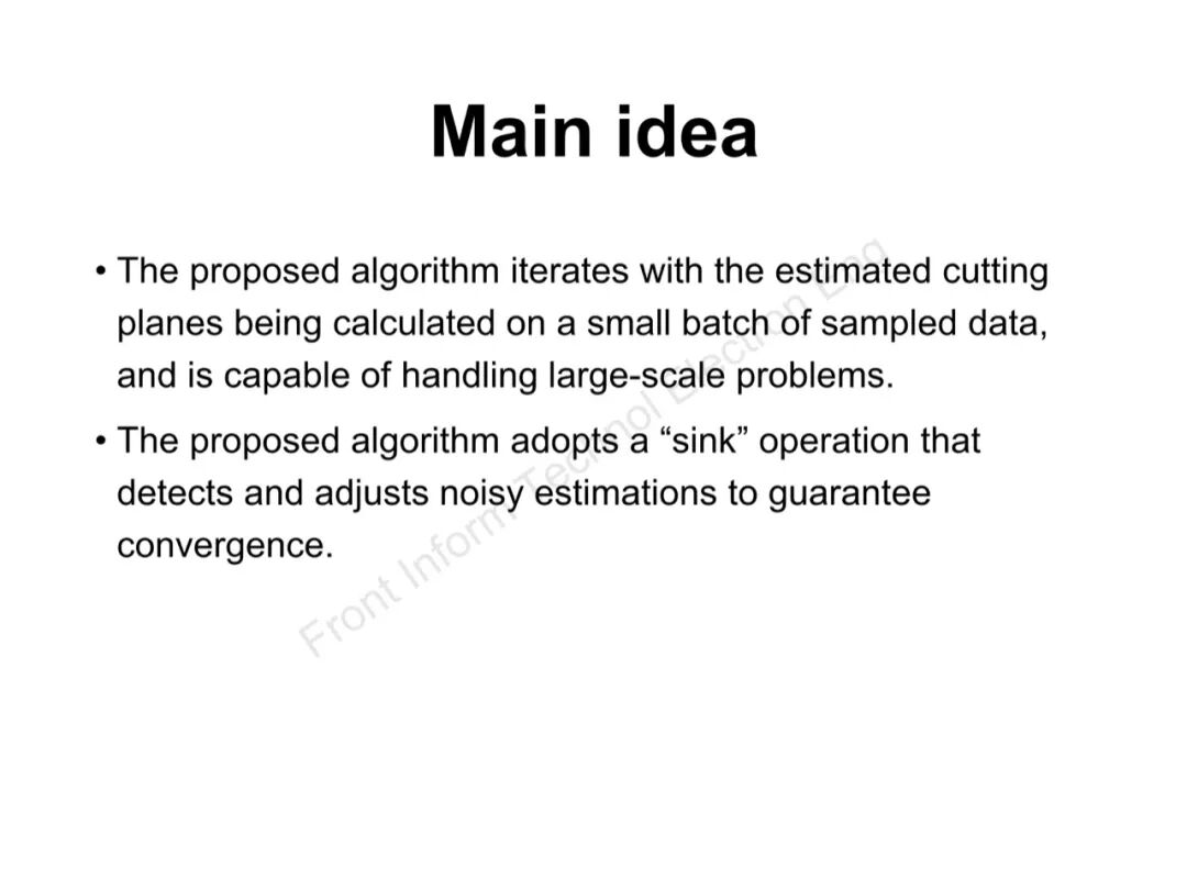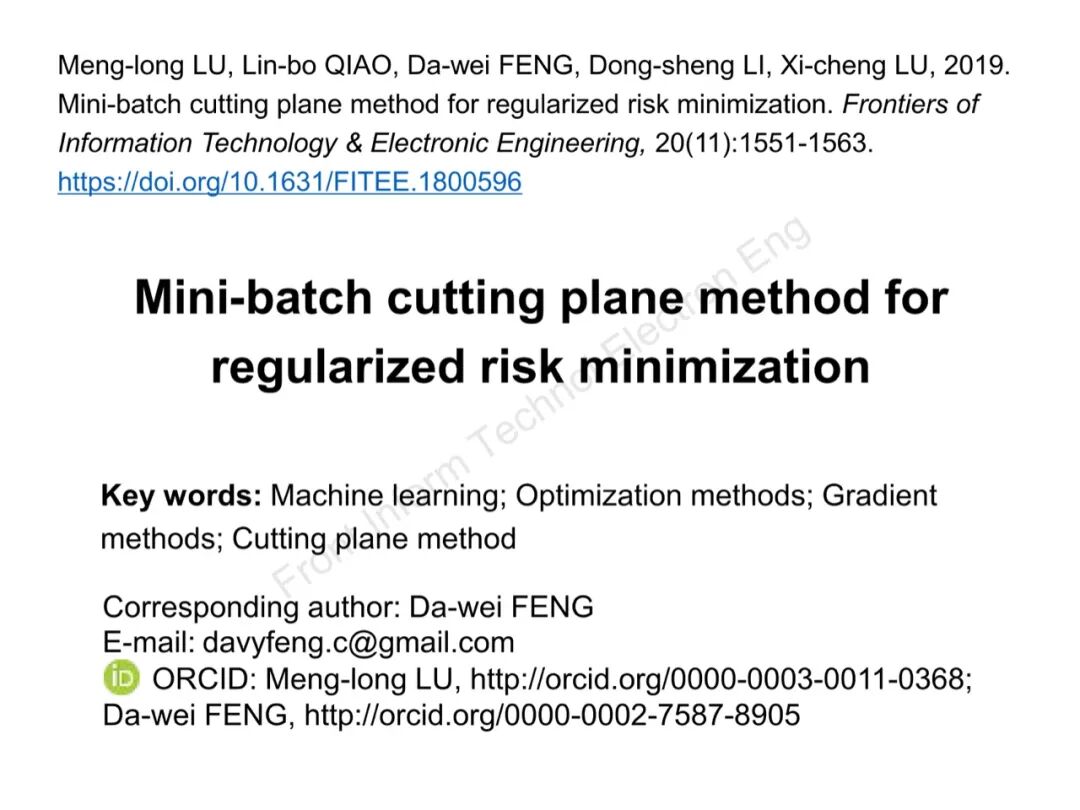 机器学习;优化方法;梯度法;割平面法| 卢孟龙,乔林波,冯大为,李东升,卢锡城 单位: 国防科技大学并行与分布处理国家重点实验室,中国长沙市,410073 本文引用格式: Meng-long Lu, Lin-bo Qiao, Da-wei Feng, Dong-sheng Li, Xi-cheng Lu, 2019. Mini-batch cutting plane method for regularized risk minimization. Frontiers of Information Technology & Electronic Engineering, 20(11):1551-1563.https://doi.org/10.1631/FITEE.1800596 |